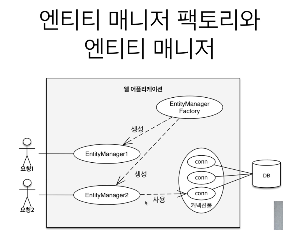 위 사진은 웹 어플리케이션에서 엔티티 매니저 팩토리와 엔티티 매니저의 구조를 나타낸 것이다.