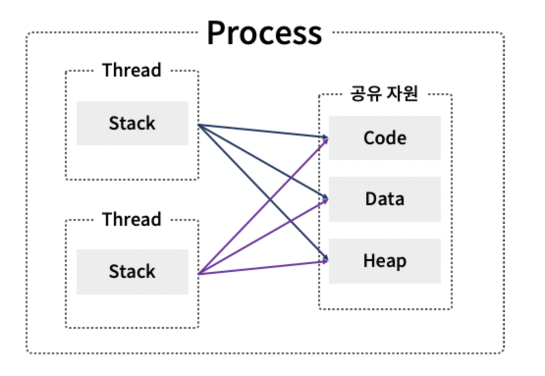 code, data, heap 의 프로세스의 자원을 공유하며 실행한다.