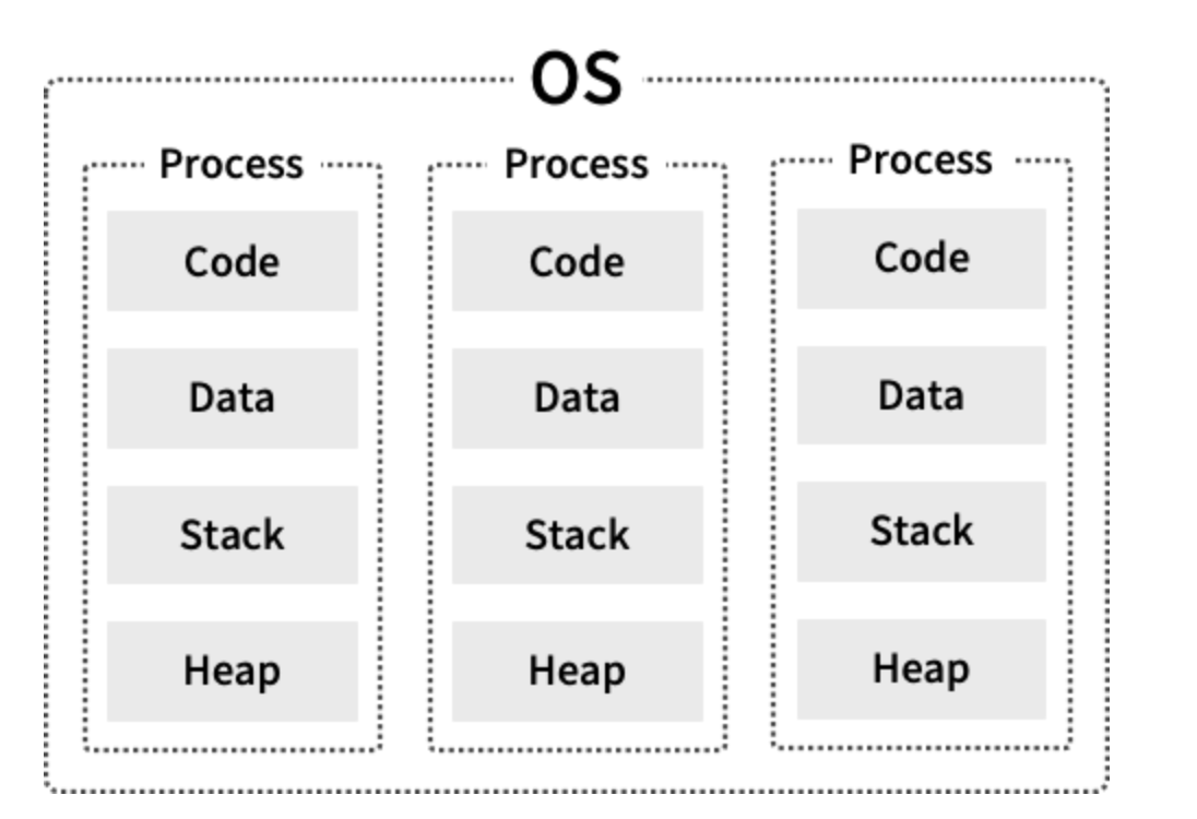 - 프로세스는 현재 실행되고 있는 즉, 메모리에 올라가서 실행되는 프로그램을 의미한다.
